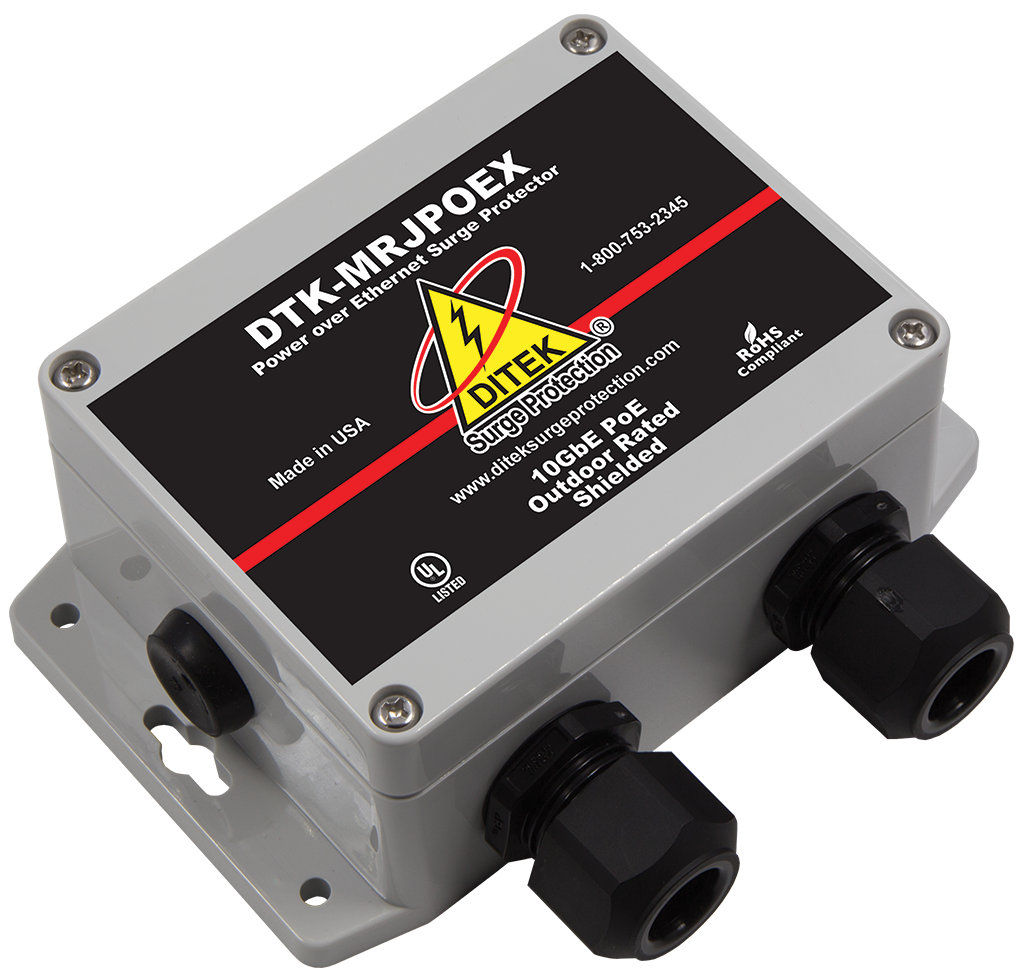 Power over Ethernet Surge Protector for Outdoor Applications DITEK's single channel DTK-MRJPOEX is designed specifically for PoE connections exposed to extreme weather conditions. The NEMA 4X enclosure with liquid-tight cordgrips provide a watertight connection when installed in harsh/outdoor environments. Uses SAD and GDT technologies for superior protection Data speeds up to 10GbE without signal degradation NEMA 4X enclosure for outdoor applications PoE Plus, HiPoE ready for high-wattage applications
