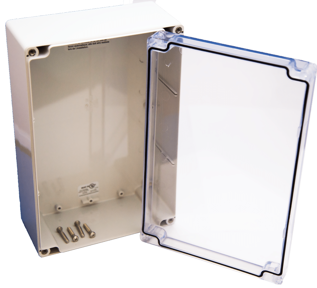 The 171-104 is a 9.25" x 6.25" x 3.63" RoHS/NEMA 4X enclosure with clear cover. Can be used to house DITEK surge protectors that are not rated for outdoor use.